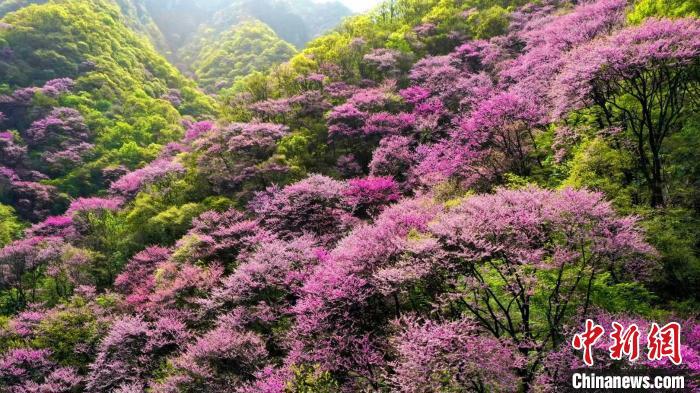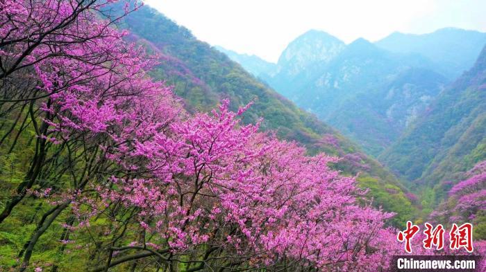 4月11日,漫山紫荊花與秦嶺交相輝映。太平國家森林公園供圖